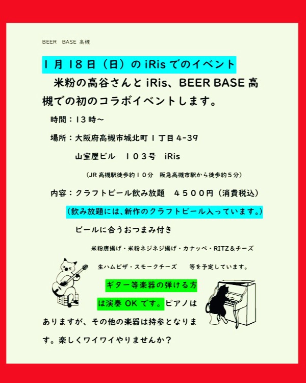 ビアベース高槻、2月28日にiRisで音楽×飲み放題イベント開催