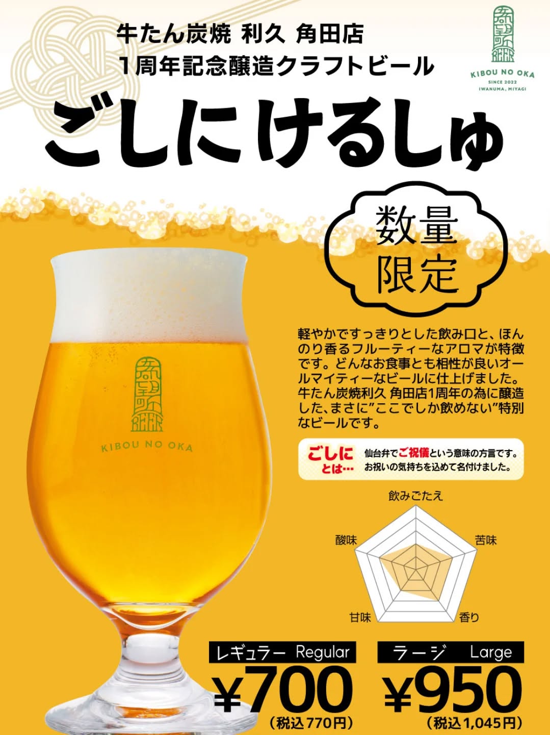希望の丘醸造所 仙南工場、角田店1周年記念の限定ビール「ごしにけるしゅ」を提供開始