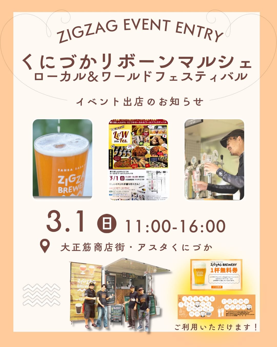 丹波篠山ジグザグブルワリー、3月1日にくにづかリボーンマルシェ出店