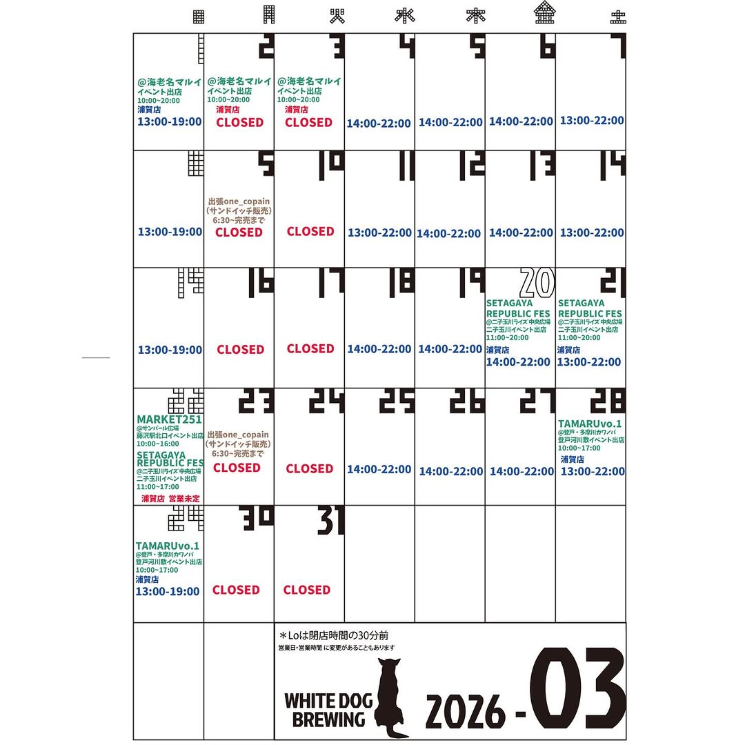 WHITE DOG BREWING浦賀醸造所、3月営業修正と3会場出店を案内